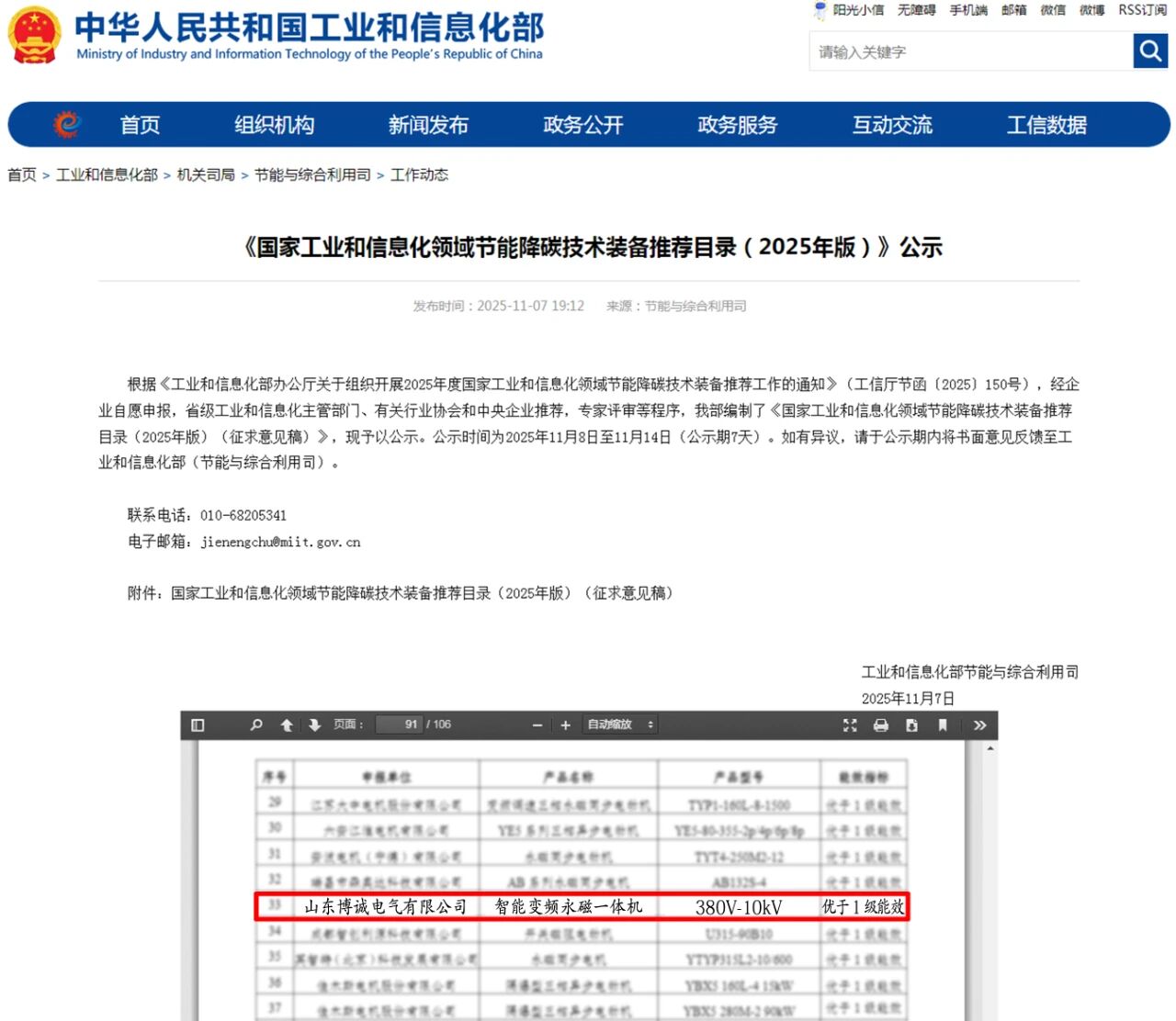 近日,工业和信息化部正式发布《国家工业和信息化领域节能降碳技术装备推荐目录(2025 年版)》,山东博诚电气有限公司自主研发的 380V-10kV 智能变频永磁一体机,成功入选 “高效节能装备” 核心板块。这是继 2024 年公司智能永磁同步变频电动机斩获该国家级权威认证后,再度获此殊荣,标志着博诚电气在工业节能降碳领域的核心技术实力与行业引领地位,获得国家层面的持续背书与高度认可。